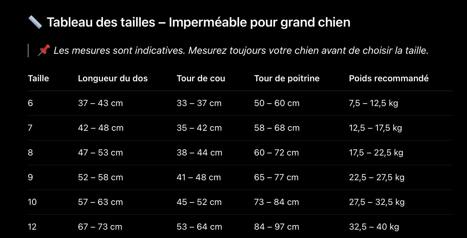 - Mesurez votre chien (dos + poitrine) avant de choisir la taille