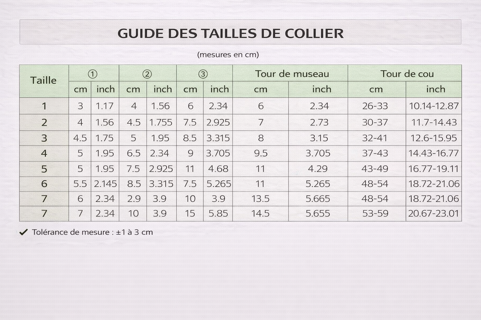👉 Merci de vous référer au guide des tailles pour choisir la muselière adaptée au museau et au tour de cou de votre chien.
